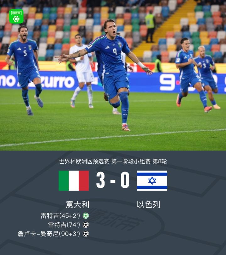 第90+3分钟,詹卢卡-曼奇尼抢点头球破门!意大利3-0完胜以色列!
